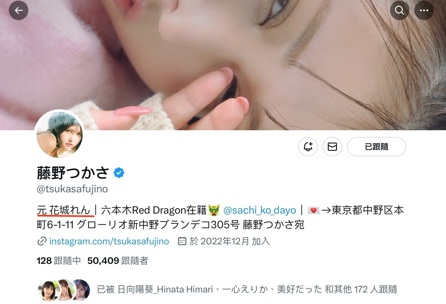 因为这是藤野つかさ(藤野司)期待已久的「重出江湖」:要找到她的社群不难,不过从X的自我介绍(https://twitter.com/tsukasafujino)就知道这位女优之前就已经在AV界发展了一阵子ー她是花城れん(花城恋),刚出道时还用过八神カレン(八神可怜)的艺名,然后除了是AV女优外,她也在六本木的AV女优酒店「Red Dragon」出勤陪酒〜